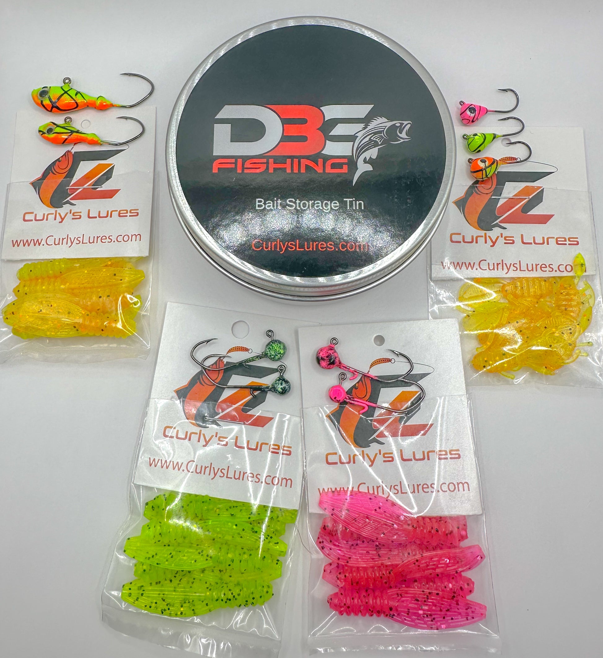 DBG Fishing Limited Edition Custom Kit includes hand made jig heads that are color matched to the corresponding soft plastics. Included is the one of a kind DBG Fishing Bait Tin that can be used to store your ice jigs, plastics or your favorite worms.